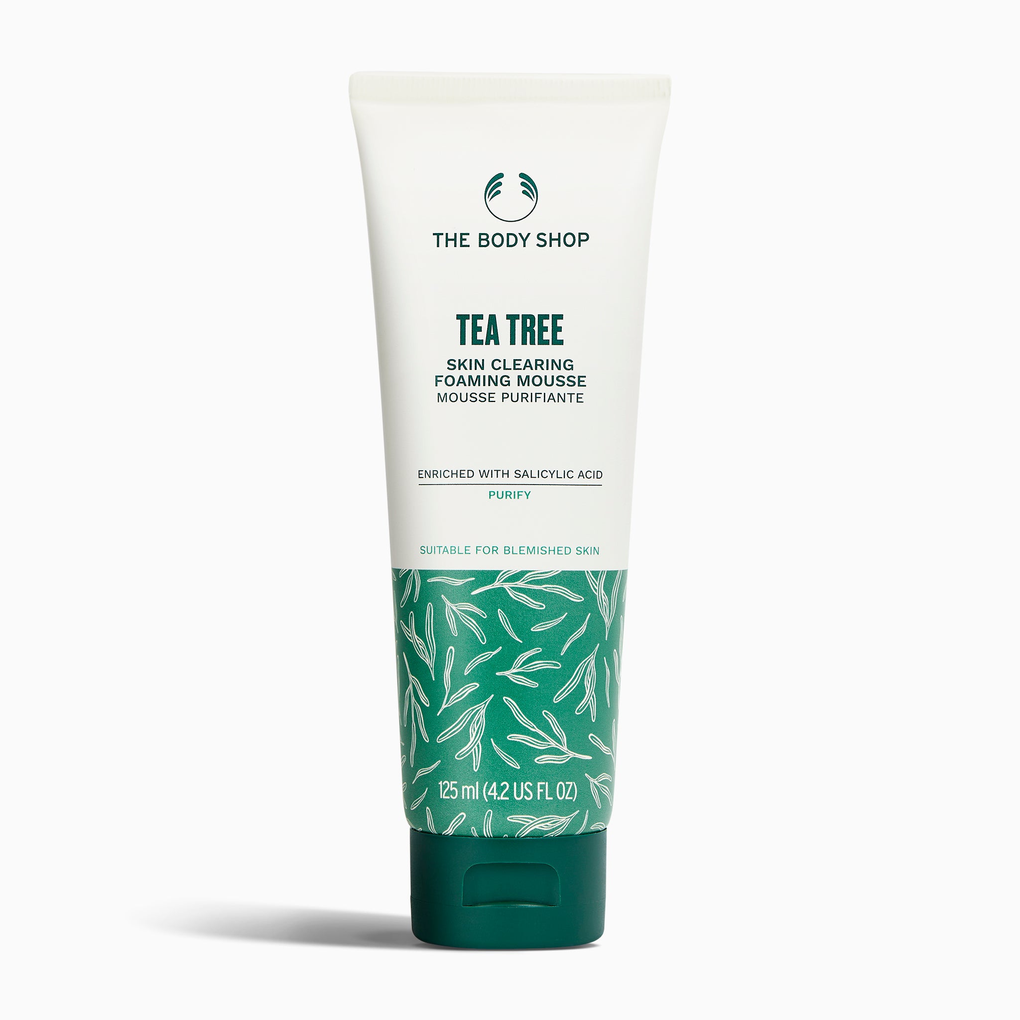 - Morning or night, pump out an almond-sized amount of our Tea Tree Skin Clearing Foaming Mousse.